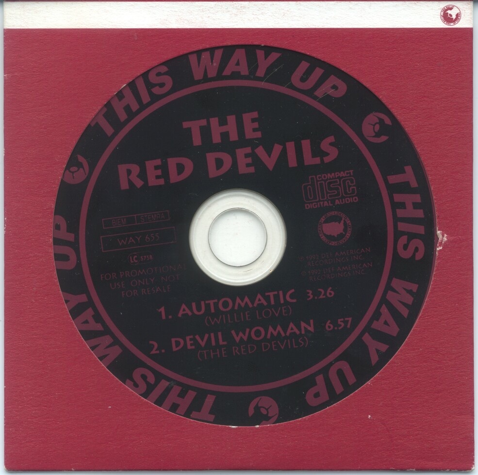 Picked up a cool little item on eBay a month or so ago: a promo-only CD single for The Red Devils’ “Automatic” and “Devil Woman.” Though it only contains two songs that you should own by now, there are still several notable things about this little single:
