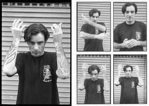 The first time I saw Lester play I had this picture in my mind: While playing you couldn’t see his face, and while singing you couldn’t see his tattooed arms the way you would when playing, and I wanted to see both at the same time. … (D)ays before this portrait was made I took some pictures at a concert in Tegelen, on stage with Lori’s backstage pass. After the concert I asked Lester if I could take his portrait when he was playing in Rotterdam and he agreed.