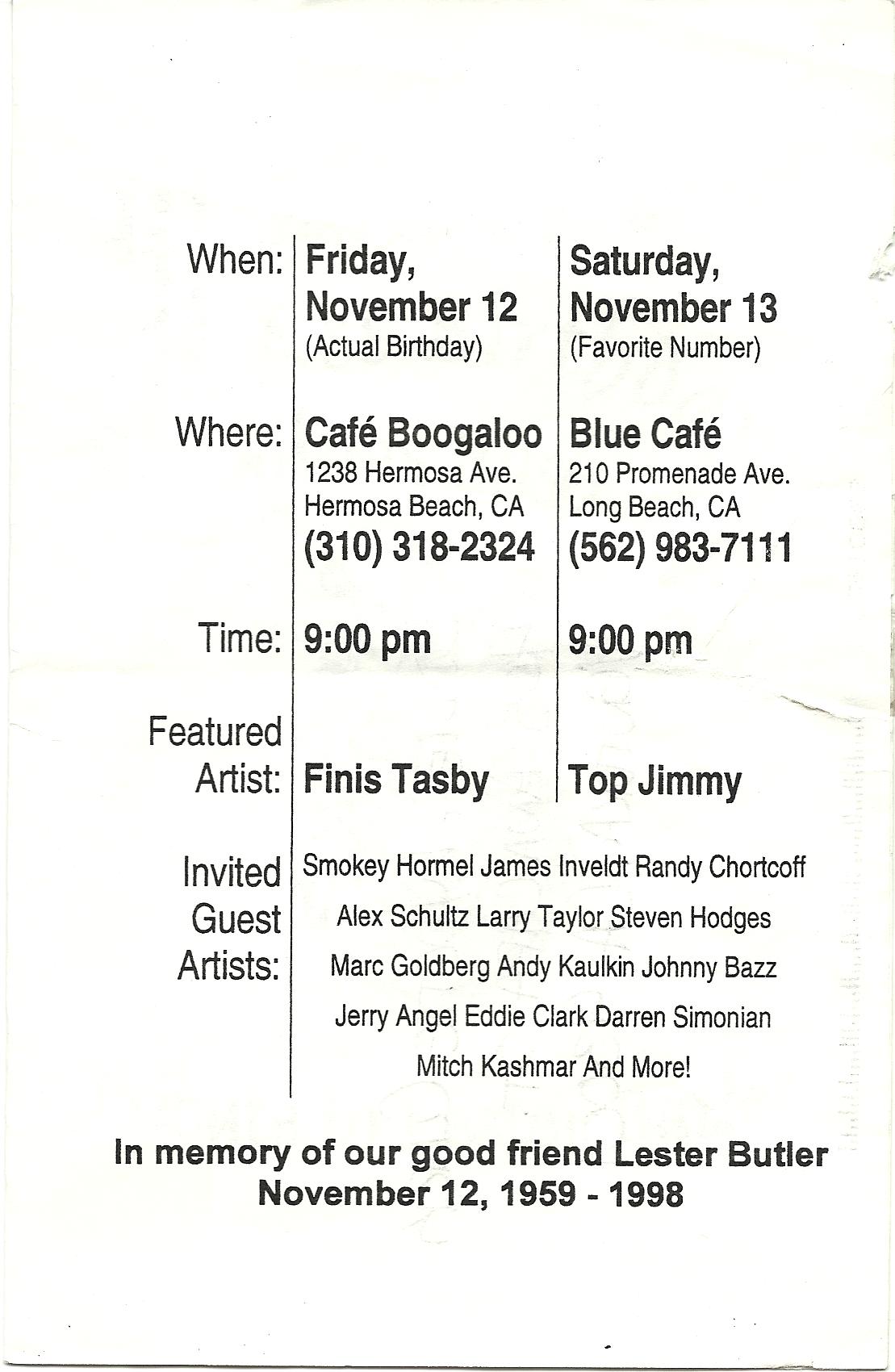 Last year, in a trove of archives sent by 13 drummer Eddie Clark, we received the backside of the memorial flier, with directions to the May 24, 1998, event, as well as a mailing for a “Bad Ass Birthday Blues Bash” for Butler on Nov. 12 and 13, 1998.