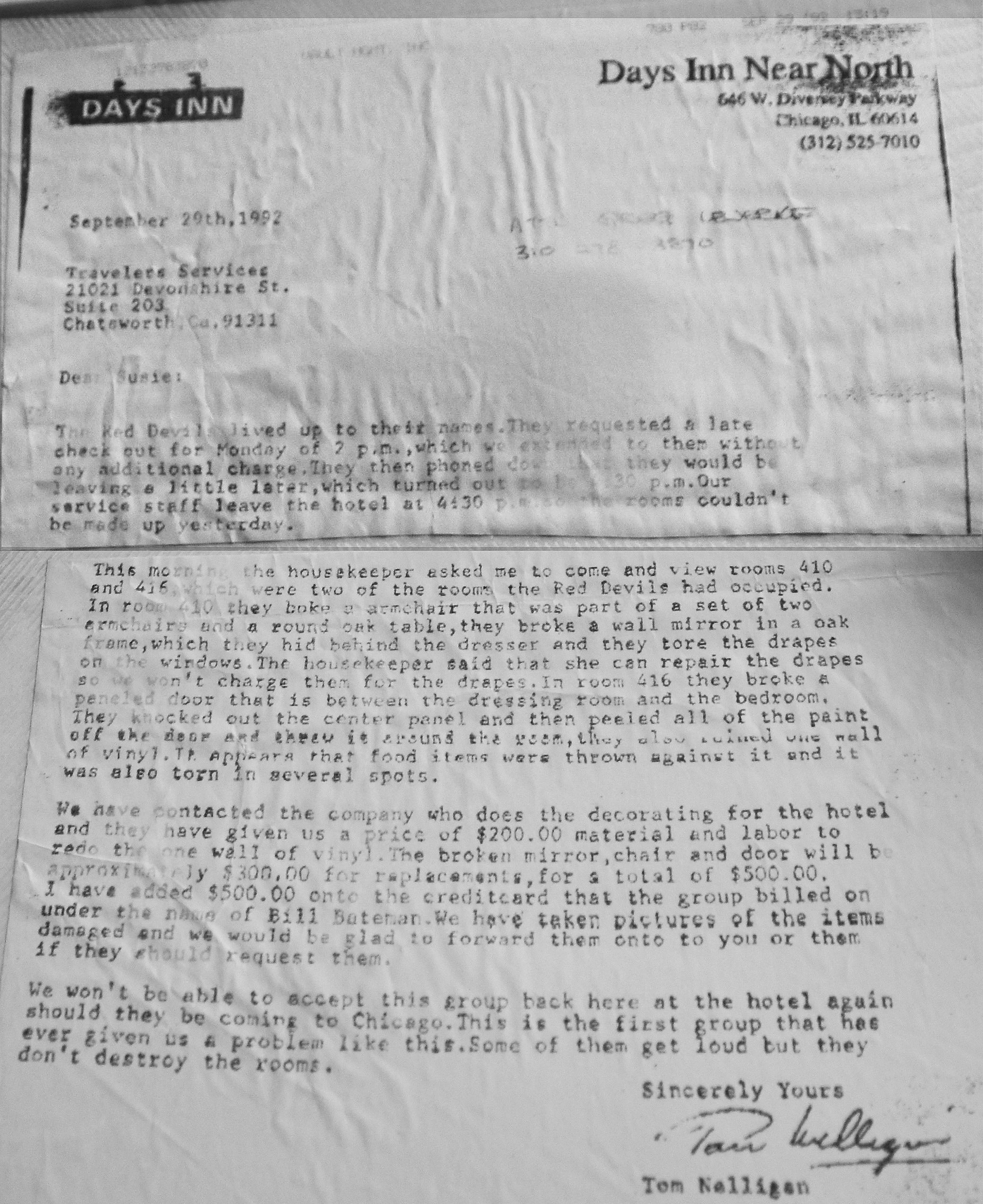 The band’s stay at the Days Inn ended in destruction Sept. 28, according to a fax Nelligan sent to the band’s travel agency.