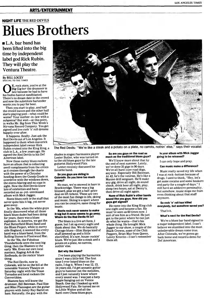 Never mind the played-out white-boy-Blues-Brothers plating of this Dec. 3, 1992, Los Angeles Times story about The Red Devils by Bill Locey.