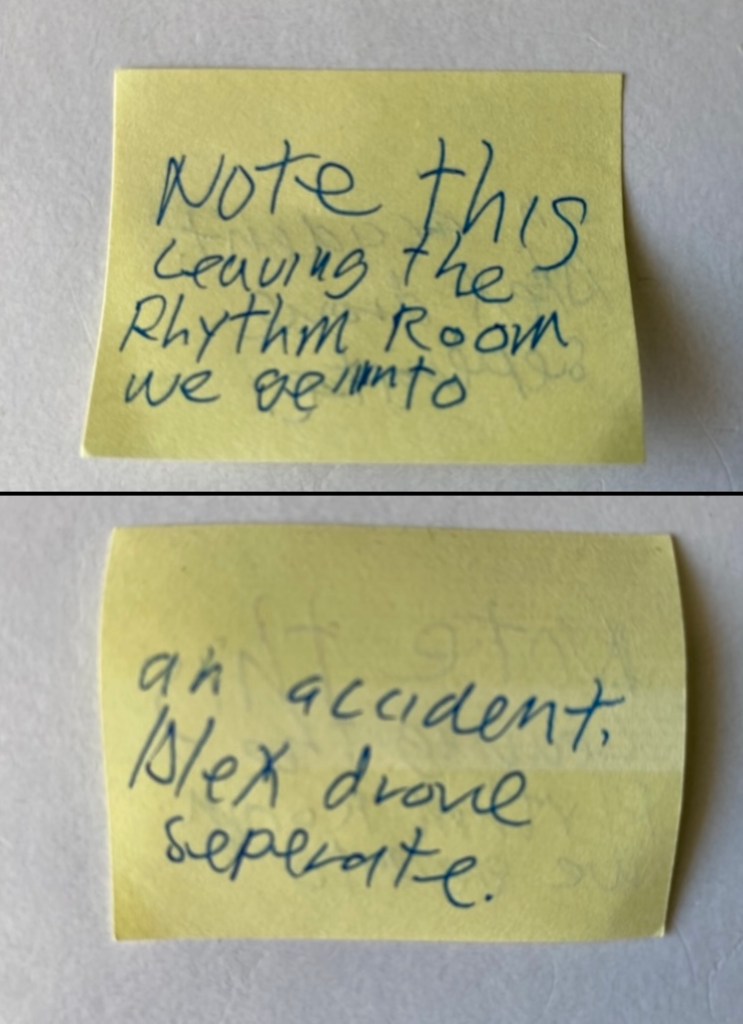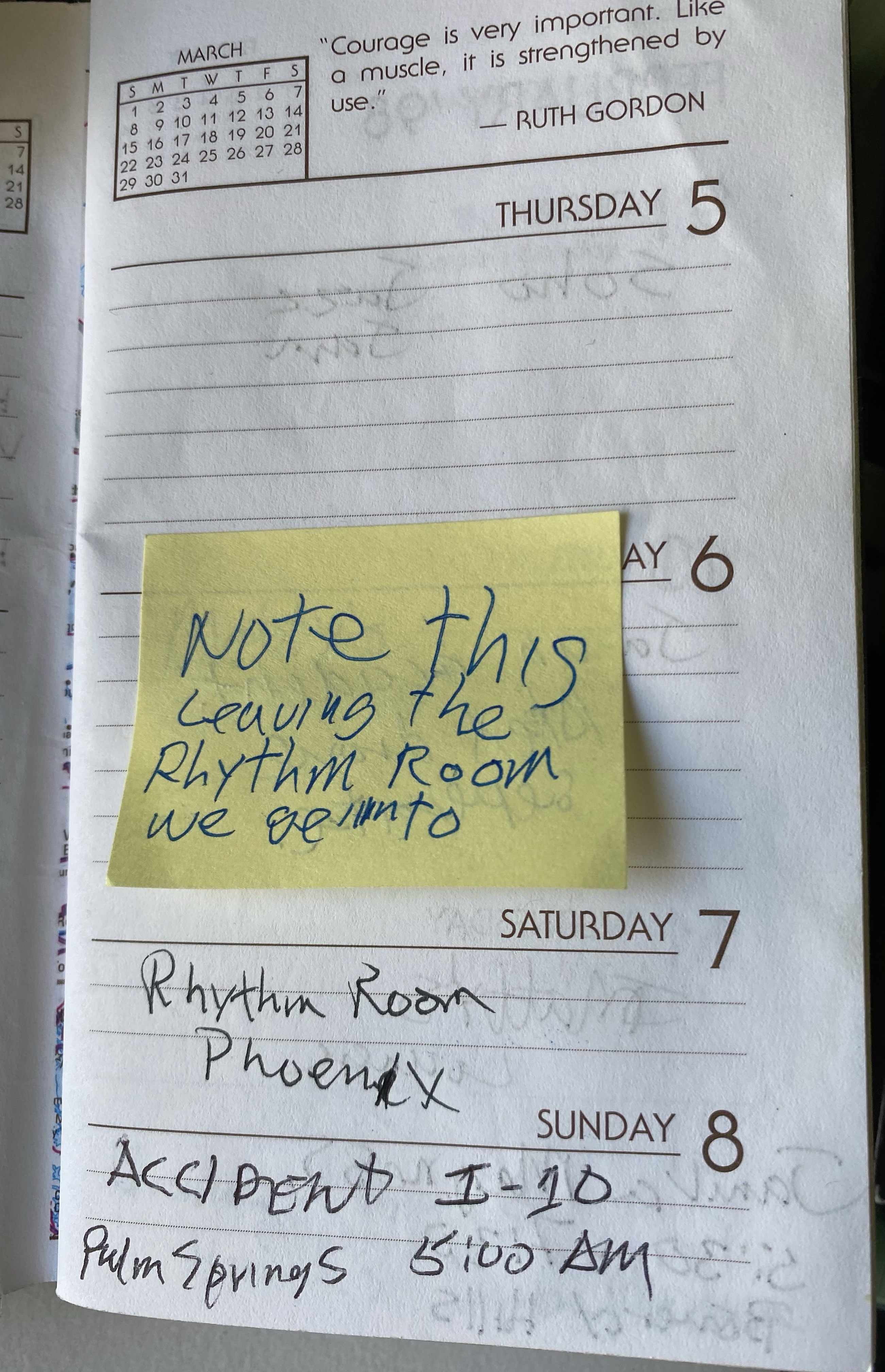 - FEB. 8: Accident on I-10 in Palm Springs, California, 5 a.m. “Note this: Leaving the Rhythm Room we get into an accident. Alex drove separate.”