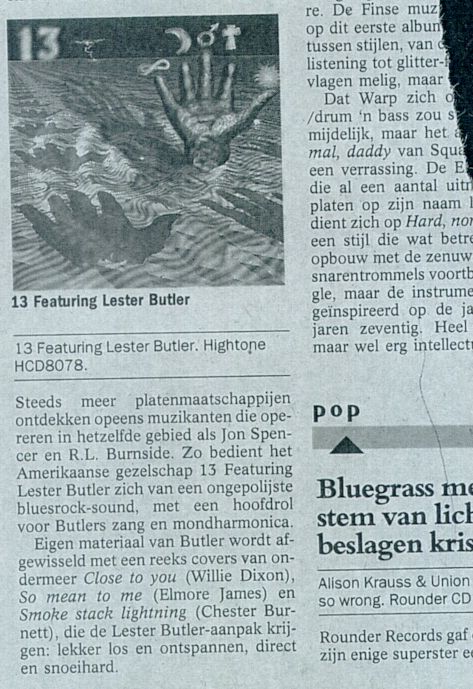 More record stores discover musicians who play the same music as Jon Spencer and R.L. Burnside. So does 13 feat. Lester Butler, from America with a polished blues-rock sound, with a main act: Butlers voice and harpplay. Own material and covers are played like: “Close to You” (Willie Dixon), “So Mean to Me” (Elmore James) and “Smoke Stack Lightning” (Chester Burnett). Those songs played by Lester are loosened, relaxed, direct and very loud.