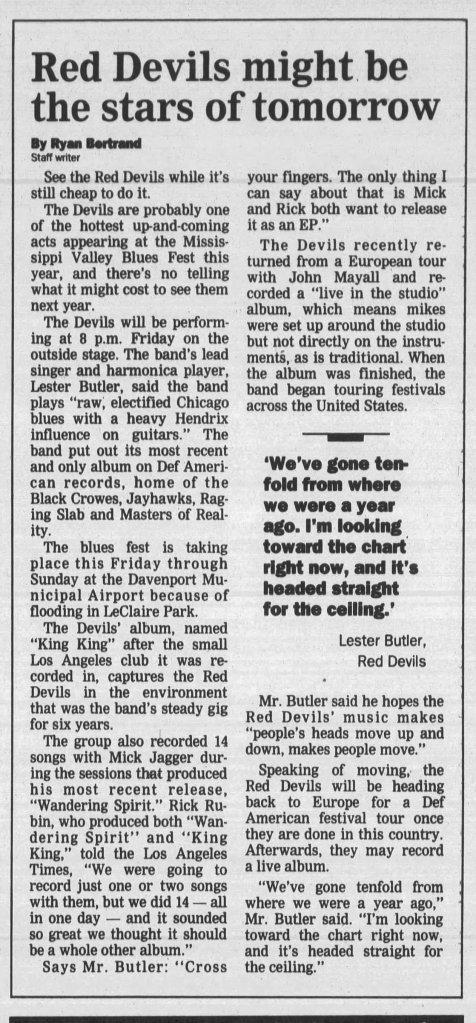 First, though, was the band’s July 2, 1993, performance at the Mississippi Valley Blues Festival in Davenport. The Dispatch offered a fresh interview with an optimistic Lester Butler: