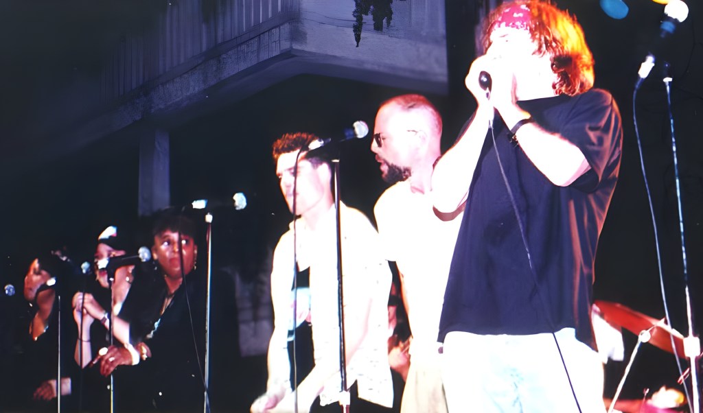 From the original Lester Butler Tribute Site we present these great photos of Lester Butler, Bruce Willis and the Planet Hollywood band, courtesy of Michele Rotter, and published with permission by Jasper Heikens.