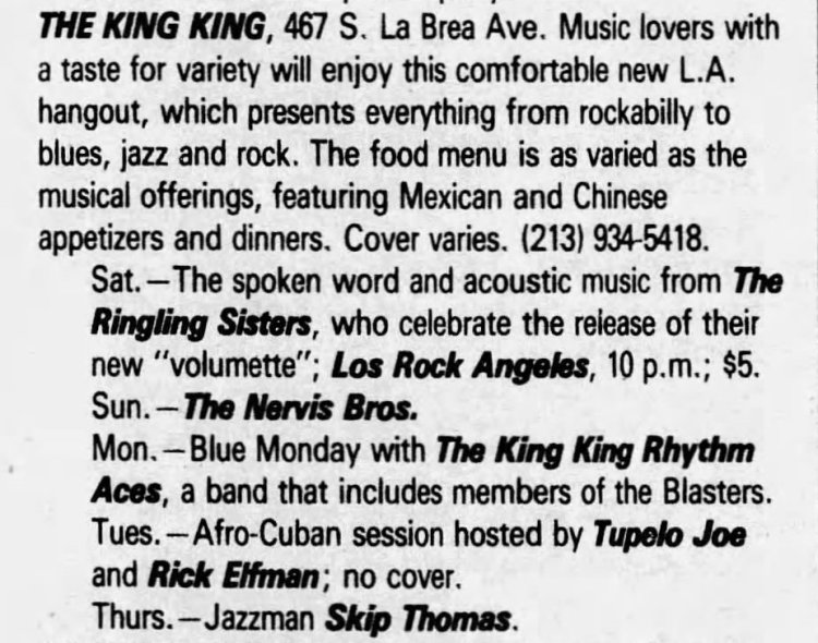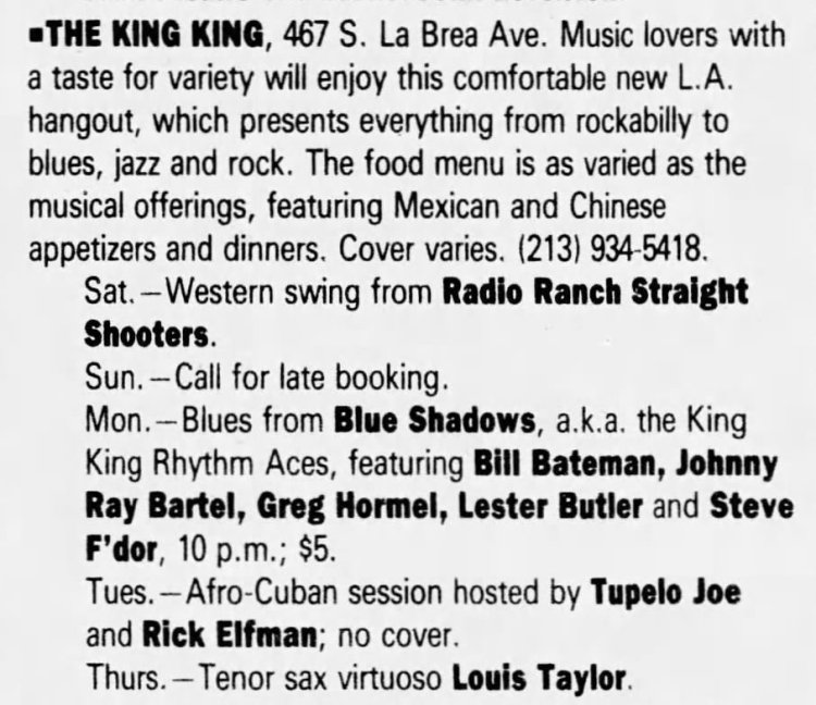 Things started getting straightened out the next couple of weeks, in the Feb. 17 and Feb. 24 editions LA Weekly calendar: “Blues from Blue Shadows, a.k.a. the King King Rhythm Aces …” (below).