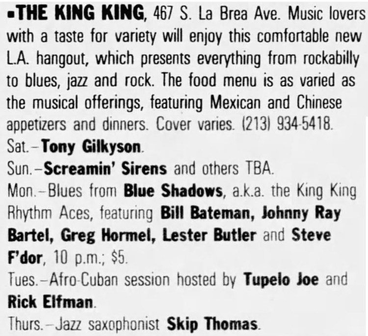It’s unlikely this band name was a deliberate choice by the players (here listed as Bill Bateman, Jonny Ray Bartel, Greg “Smokey” Hormel, Lester Butler and piano player Steve F’dor), but likely whoever had to call in the King King schedule to the local papers. (“Yeah, Monday night, we have a bunch of Blasters and friends playing blues … I don’t know if they have a name … just call ’em The King King Rhythm Aces.”)