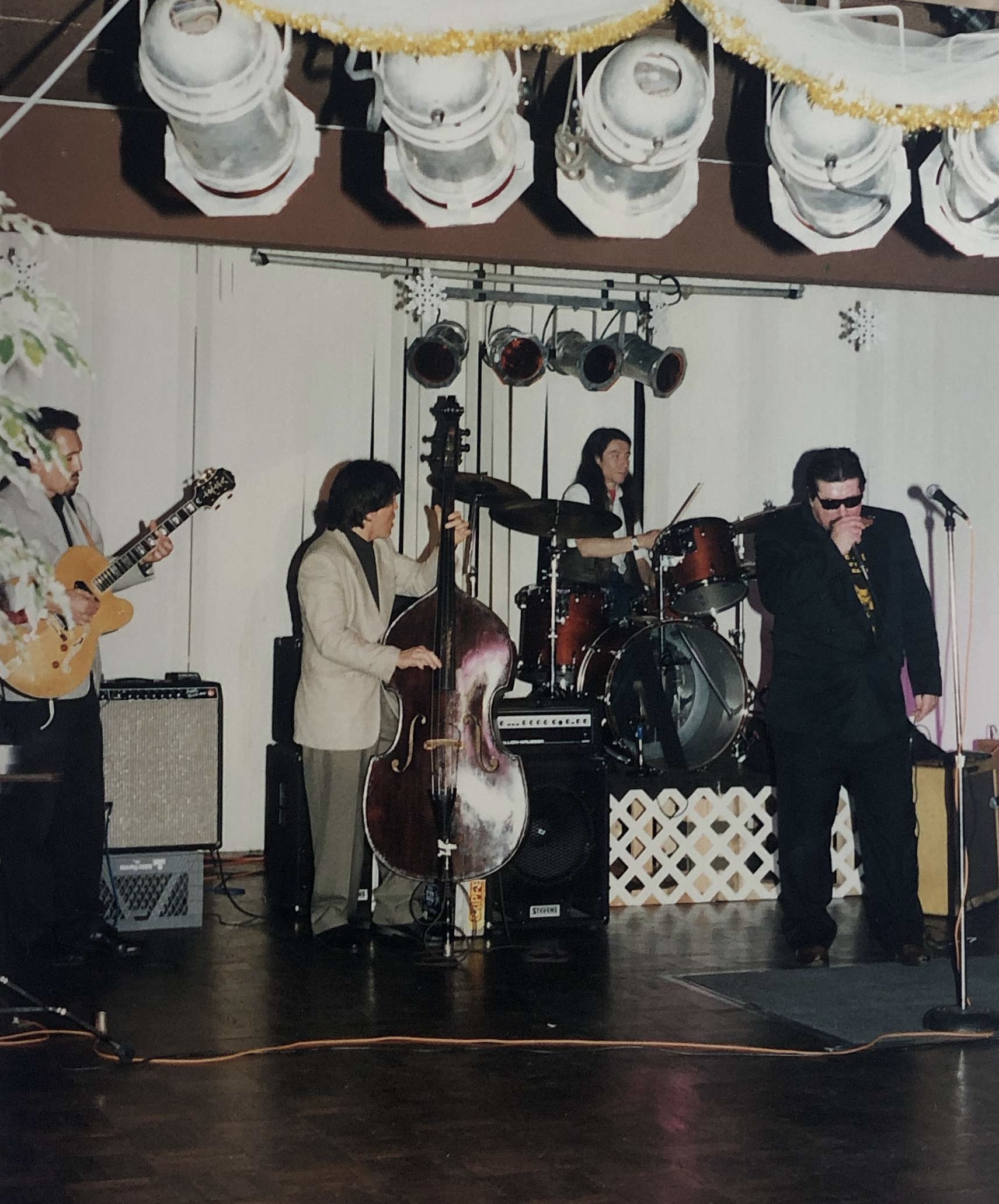 The William Clarke Band (with Jeff Ross, Rick Reed, Eddie Clark and Greg Verginio) perform at a Christmas party in Long Beach, California, in 1995.