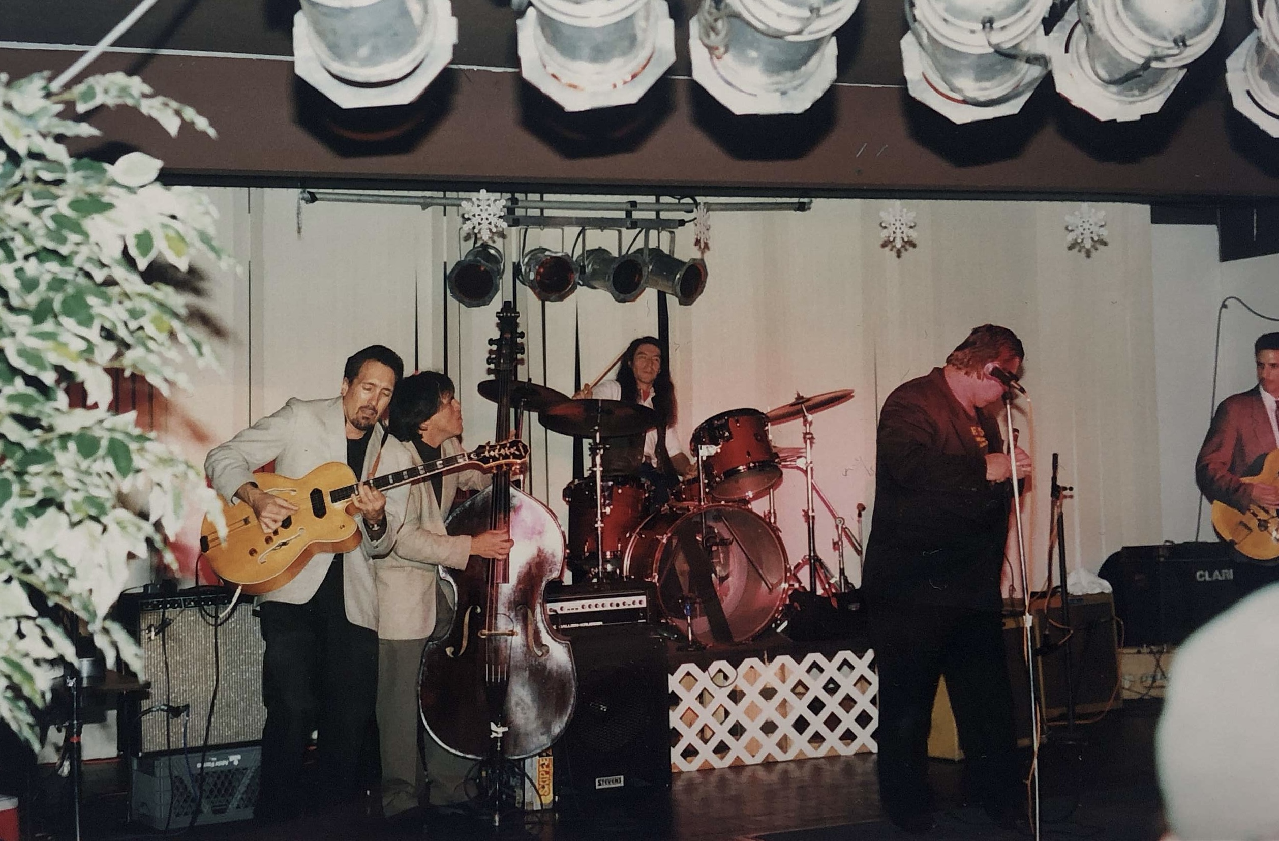 The William Clarke Band (with Jeff Ross, Rick Reed, Eddie Clark and Greg Verginio) perform at a Christmas party in Long Beach, California, in 1995.