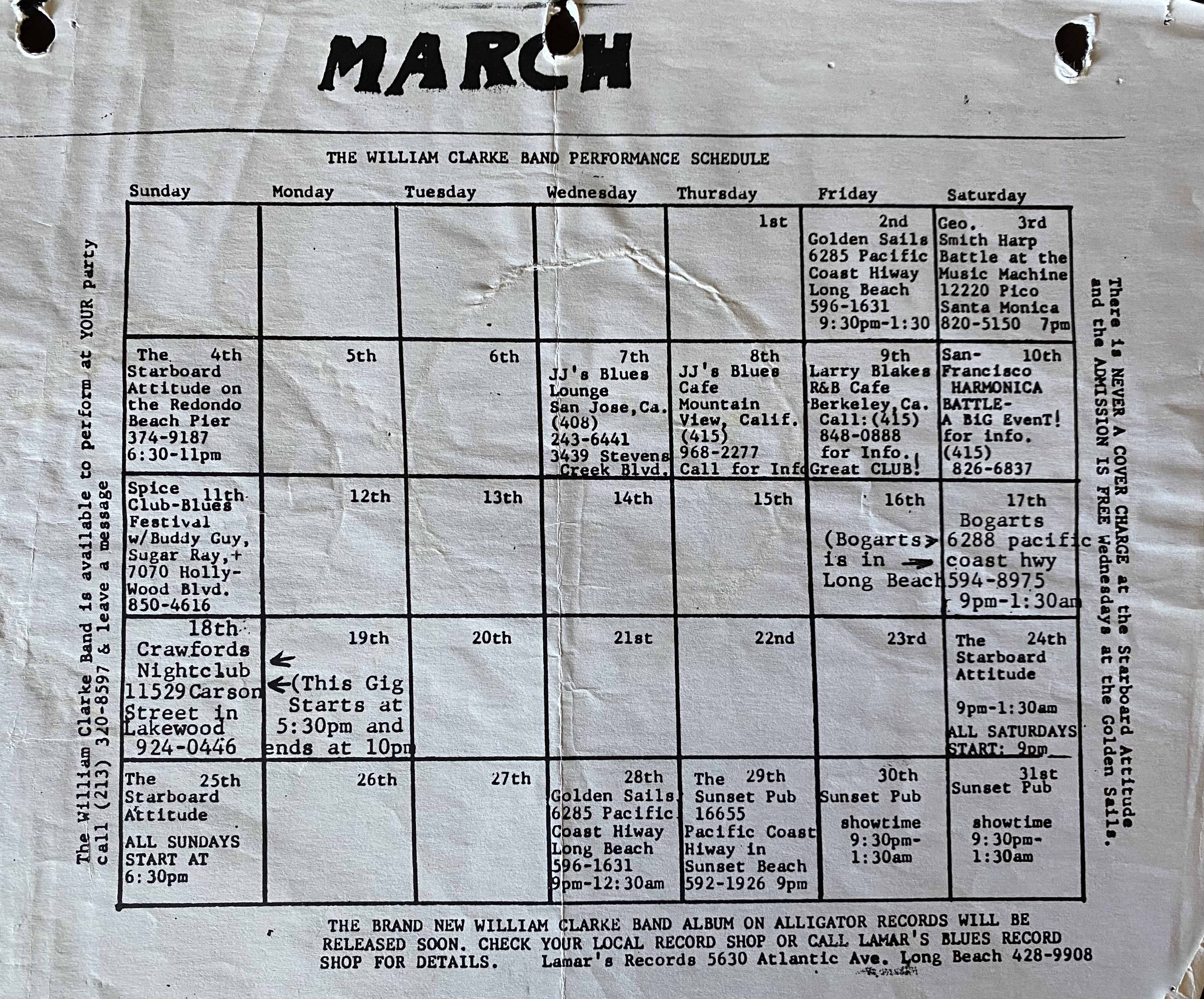 William Clarke Band March schedule.