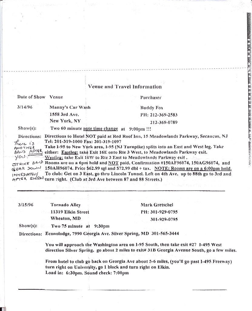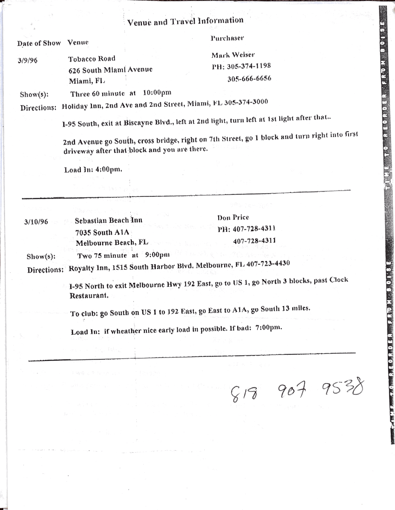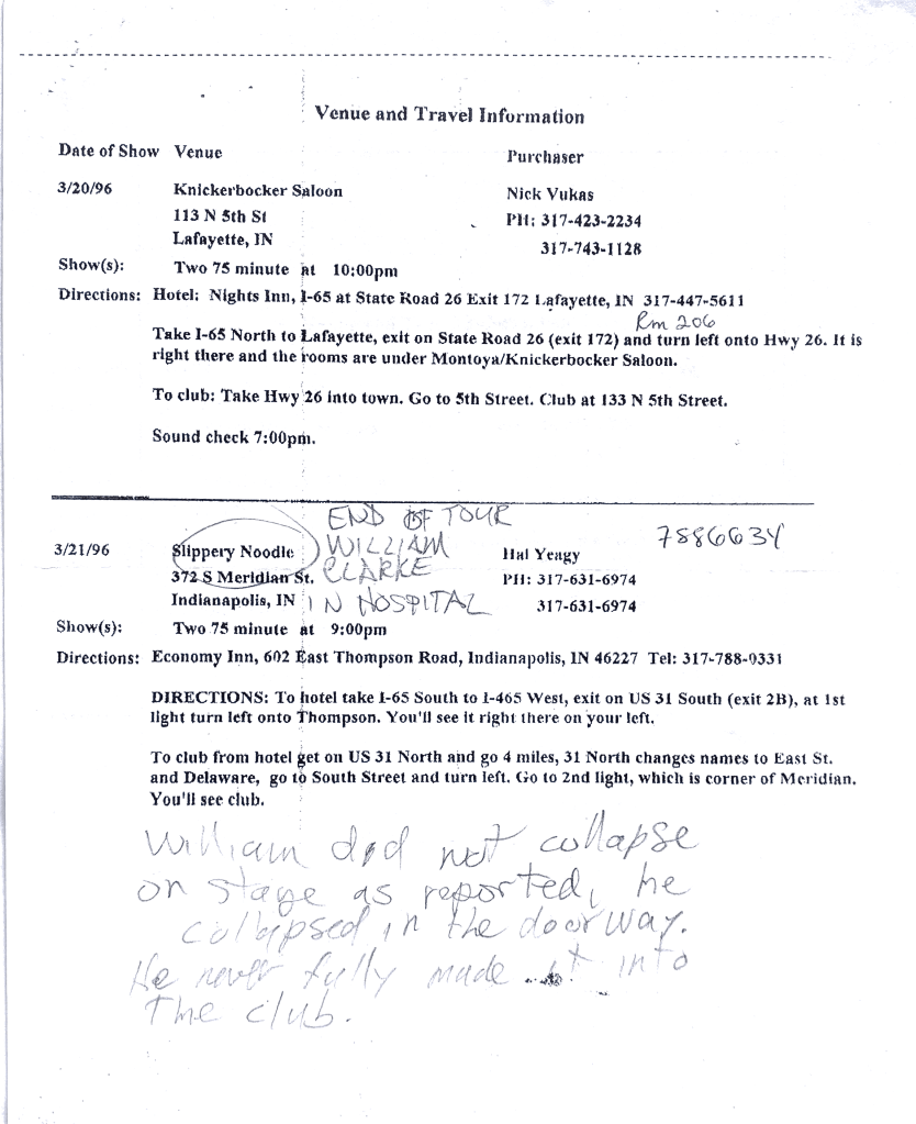 The William Clarke Band was on tour in March of 1996. These tour itineraries, courtesy of Eddie Clark, give a unique look into the life of a touring blues musician (especially pre-Internet). Of particular interest is page 6, which includes Eddie Clark’s notes from the night of William Clarke’s collapse at the Slippery Noodle Inn in Indianapolis on March 21, 1996.